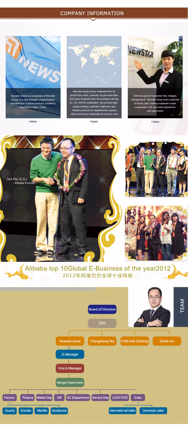 Бизнес-идея Newstar заключается в том, что «мы предложим широкий спектр хорошо спроектированных, натуральных камней, искусственных камней с нашим собственным отличным качеством